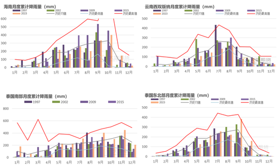 厄尔尼诺对下半年真有影响?预计下半年进入厄尔尼诺,理论上会造成东南亚干旱,但是从历史上来看(类比1997年、2002年、2009年、2015年、2023年),下半年不可能一点降雨都没有,甚至略少一点的降雨应该是更有利于割胶天数的增加(如去年7月份云南下雨太多影响割胶),更没有发生过下半年干旱导致停割的现象。